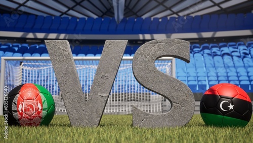 © Александр Бердюгин, Obraz premium A soccer match between Afghanistan and Libya is symbolized by two soccer balls with their national flags and a large vs on a stadium field