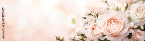 © Seksan, Obraz premium A soft, blurred background features delicate pink roses and flowers, creating a serene and romantic atmosphere.