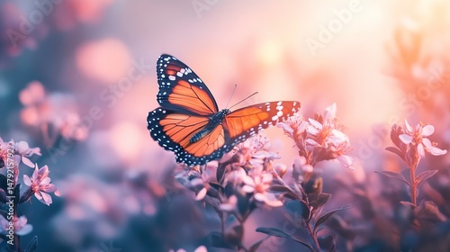 © Phonphysith, Naklejka premium A soft-focus image of a butterfly dancing around blooming flowers.