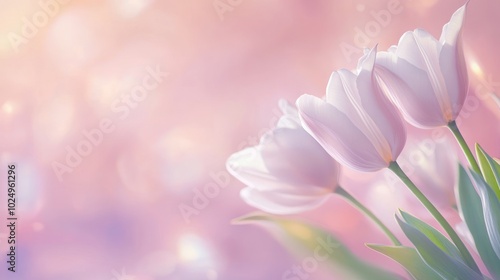 © BerkahStock, Fototapeta premium A soft-focus image of delicate pink tulips against a dreamy pastel background.
