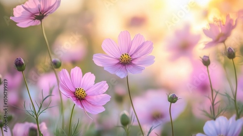 Fototapeta premium A soft-focus macro shot of pink hibiscus flowers, glowing under diffused...