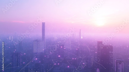 Obraz premium A soft-focus view of a city skyline at sunrise with glowing network lines...