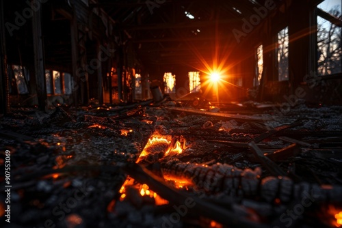 © Thi, Obraz premium A soft glow amidst soot and cinders highlights the somber aftermath of a fire.