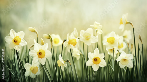Fototapeta premium A soft light springtime nature background with narcissus flowers in the garden.