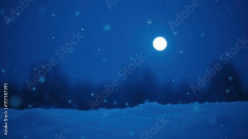 © Backdrop Bliss, Naklejka premium A Soft Moonlight Illuminates a Wintery Landscape as Delicate Snowflakes Fall Gracefully Through the Air