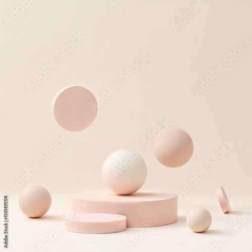© Chantis, Fototapeta premium A soft pastel 3D scene featuring floating oval and spherical forms arranged in perfect visual balance. Subtle shadows on a matte surface. No texture, smooth surfaces only. Minimal, clean, suitable for