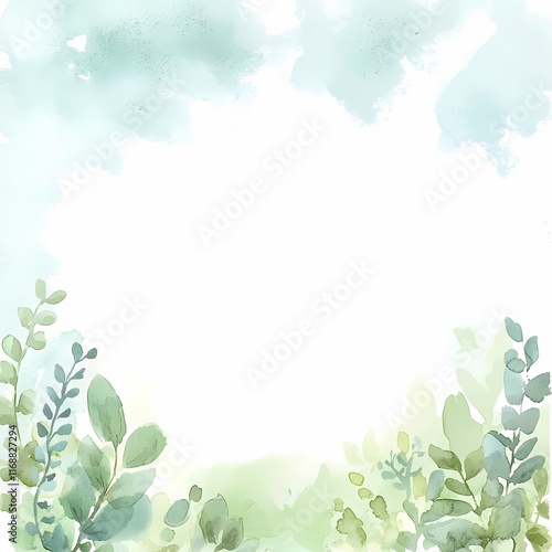Fototapeta premium A soft watercolor background featuring lush green foliage and a blank center...