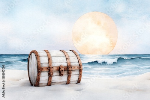 © Thammarong, Fototapeta premium A soft watercolor painting of a treasure chest on a moonlit beach, with the ocean waves glowing softly and light spilling out of the chest