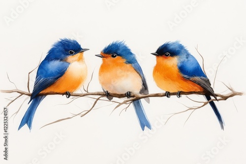 © Thanyarat, Fototapeta premium A soft watercolor painting of two birds in complementary colors, such as one with bright orange feathers and the other with deep blue, perched on a branch