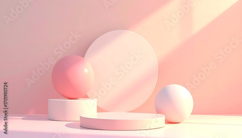 Fototapeta premium A softly lit, minimalist scene featuring three geometric forms in light pink...
