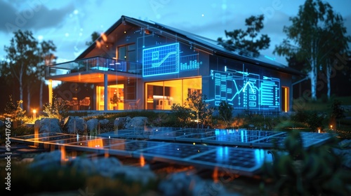 © UMAR SALAM, Obraz premium A solar-powered home with a sophisticated energy management system, displaying energy production and storage metrics on a digital interface.