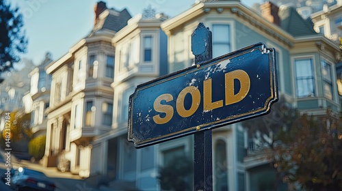 © Umri, Fototapeta premium A "sold" home sign with the house, representing real estate transactions.