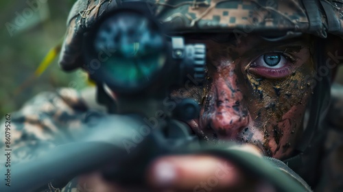 © Ibad, Obraz premium A soldier crouched in a sniper position