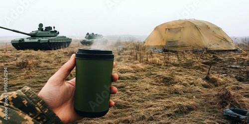 © Irina Ukrainets, Fototapeta premium A soldier holds a green thermos while standing in a field. Tanks and a tent are visible in the background. This image captures the essence of military life outdoors. AI