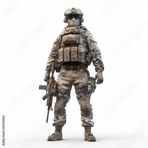 Fototapeta premium A soldier in a military uniform stands in front of a white background