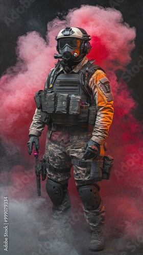 © Solikah, Fototapeta premium A soldier in full tactical gear and a gas mask stands in a cloud of pink smoke, looking to the side.