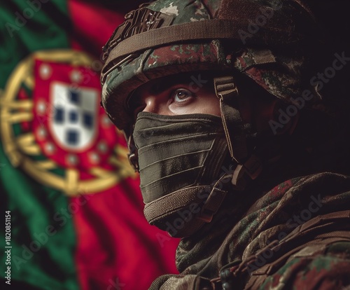 © silver bug, Obraz premium A soldier in tactical gear stands resolute, with the Portuguese flag prominently displayed behind him. The image conveys patriotism, strength, and military focus.