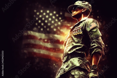 © siti, Fototapeta premium a soldier in uniform with the American flag in the background