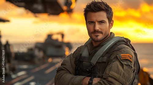 © Anugrah, Fototapeta premium A soldier stands at sunset on a naval ship