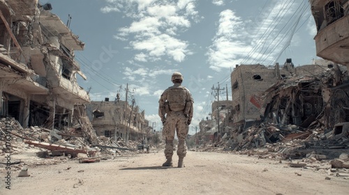 Obraz premium A soldier stands in the middle of an abandoned street, surrounded by...