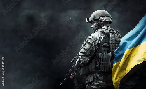 © Olena Dziuba, Naklejka premium A soldier with a machine gun next to the flag of Ukraine. Flag Day of Ukraine. Ukrainian flag. AI generated