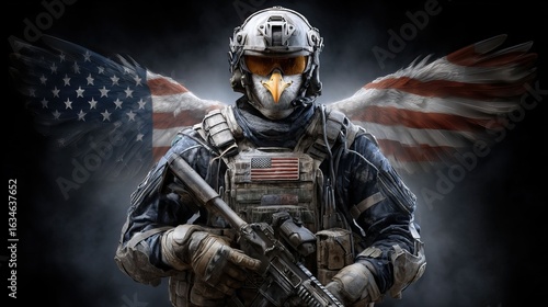 © trustmastertx, Fototapeta premium A soldier with an eagle's head and US flag wings, representing strength and freedom