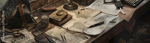Obraz premium A soldiers desk cluttered with battle plans and personal mementos, a poignant blend of professional duty and personal memories