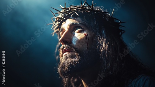 © liliyabatyrova, Obraz premium A solemn figure gazes upwards, adorned with a crown of thorns. Shadows dance around, creating an atmosphere rich in emotion and significance, reflecting themes of sacrifice and redemption