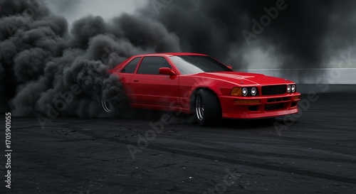 © Lari Rabello, Fototapeta premium A solid red racing car doing a burnout, thick smoke around tires, asphalt cracking slightly, dramatic cinematic perspective, no logos, no text.