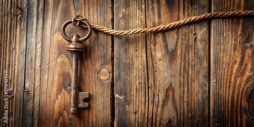 © Vibrant Visions Pixe, Fototapeta premium A solitary antique key tied with a rough rope hangs against a backdrop of weathered wooden planks.