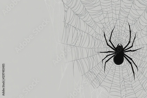 © Khatyjay, Obraz premium A solitary black spider intricately weaves its web against a soft gray background