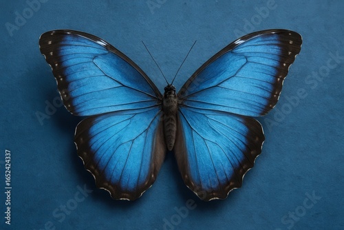 © Viktor, Fototapeta premium A solitary blue butterfly rests on a textured blue background, its wings spread wide in a display of natural beauty