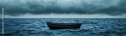 Naklejka premium A solitary boat floats on serene water beneath a moody sky, evoking feelings...