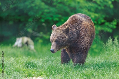 Naklejka premium A solitary Brown Bear ambles through the lush green meadow, its gaze lowered,...