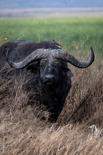 Naklejka premium A solitary Cape buffalo emerges from the tall golden grass in the Tanzanian savanna