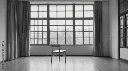 Obraz premium A solitary chair in an empty room with large windows, soft light filtering...