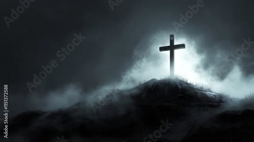 © IMAGINIAC, Naklejka premium A solitary cross stands atop a misty hill
