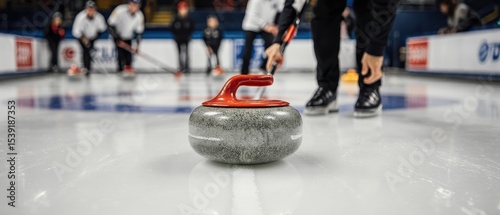 © K1drock, Fototapeta premium A solitary curling stone with a red handle sits on polished ice, grooves visible, background softly blurred with active players