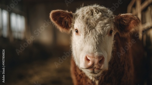 Fototapeta premium A solitary dairy cow with textured fur, bathed in gentle light, embodying...