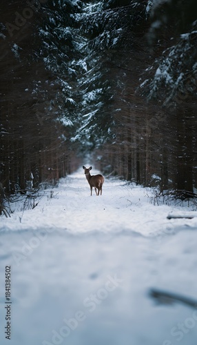© decorator, Obraz premium A solitary deer finds peace on a snow dusted path within a tranquil winter forest scene