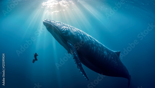 © thanaseth, Fototapeta premium A solitary diver swimming alongside a blue whale in the depths of the ocean.