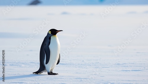 Fototapeta premium A solitary emperor penguin standing on snowy, icy terrain in a cold, remote...