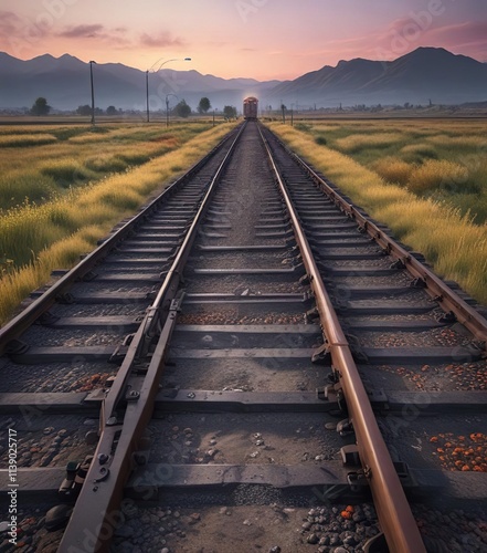 © suchetpong, Obraz premium A solitary empty train platform in the middle of a fields, scenery, nature