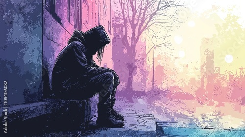 Obraz premium A Solitary Figure Contemplating Life Amidst Urban Ruins, Surrounded by a Dreamlike Landscape of Soft Colors and Ethereal Light