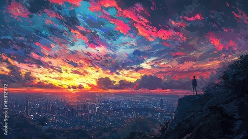 © Nuriya, Fototapeta premium A solitary figure gazes at a vibrant sunset over a city.