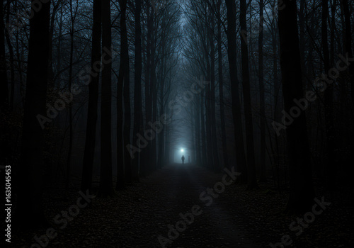 Obraz premium A solitary figure illuminated by a bright light in a dark dense forest at night