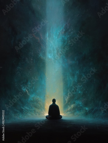© Johannes, Obraz premium a solitary figure immersed in deep meditation surrounded by an enchanting ethereal light portal representing a journey of selfdiscovery and spiritual connection amidst cosmic energy