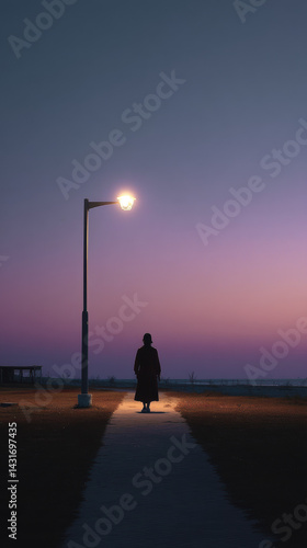 © MasTPX, Obraz premium A solitary figure in a dark coat walks along a path illuminated by a glowing street lamp against a soft gradient of purple and blue in the twilight sky near the sea.