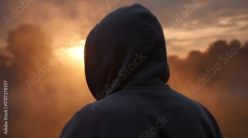 Naklejka premium A solitary figure in a dark hood looks towards a dramatic hazy sunset glow...