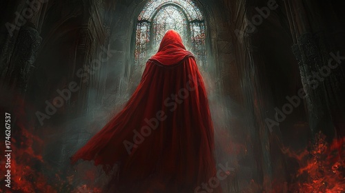 © Andi, Obraz premium A solitary figure in a flowing red cloak stands before a luminous stained-glass window in a dark, ancient cathedral, amidst an ominous glow.